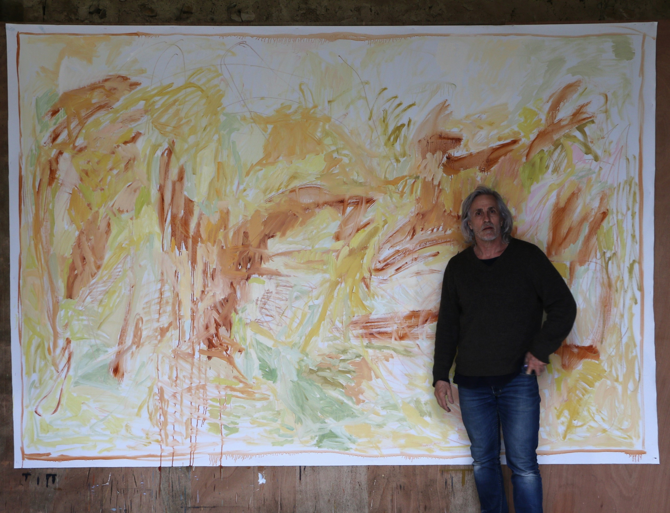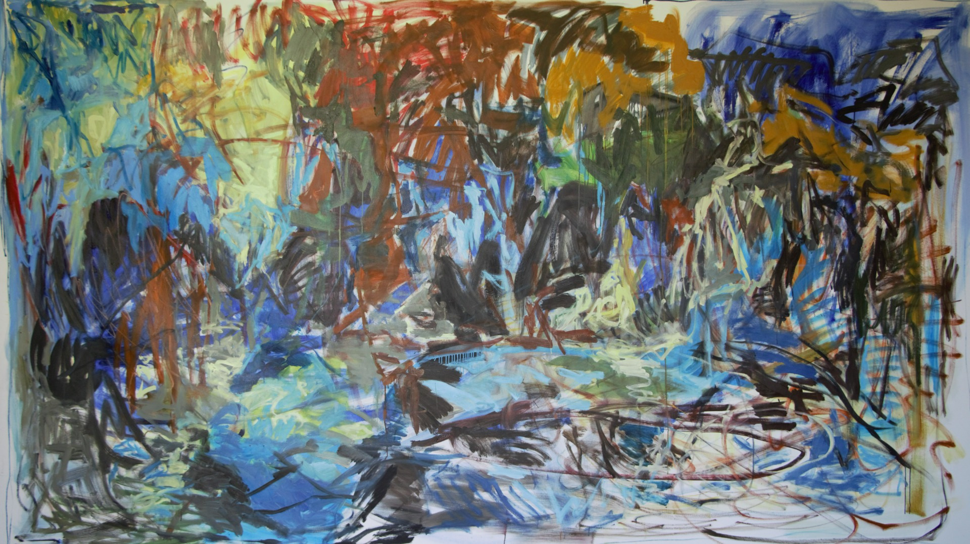 Le tableau se construit de séances en séances, et je ne sais pas à l’avance ce qu’il deviendra. Le format est un élément déterminant dans sa construction. Ma peinture est très gestuelle. Je m’immerge progressivement dans le tableau, je le parcours de l’intérieur, conjuguant divers éléments plastiques pour en faire mon propre langage (rapport de couleurs, matière, lumière). Je cherche une unité dans l’ensemble de la composition conjuguant les rapports de couleurs, les rapports de formes et la dynamique des traits.